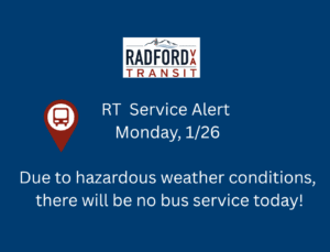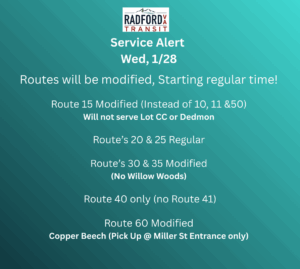 Radford Transit routes will be modified, starting regular time! Please take care when boarding and exiting vehicles. The roads and curb surfaces may be slippery. Facebook will be updated with any time changes tomorrow.